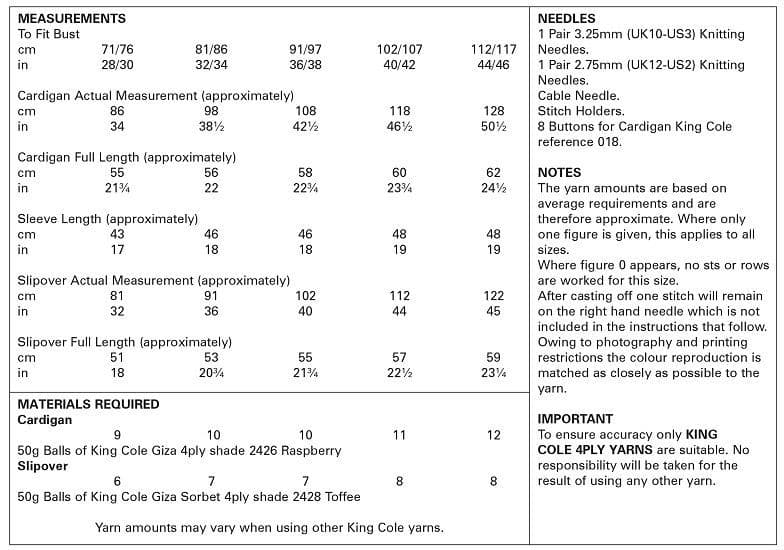 King Cole Giza Sorbet 4ply Cardigan Slipover Knitting Pattern 5402