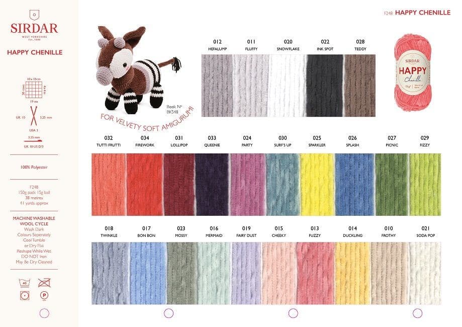 Happy Chenille a velvety soft addition to the Happy amigurumi range, these irresistible little balls of Sirdar Happy Chenille will make your cute crochet characters even more adorable. 15g = 38m